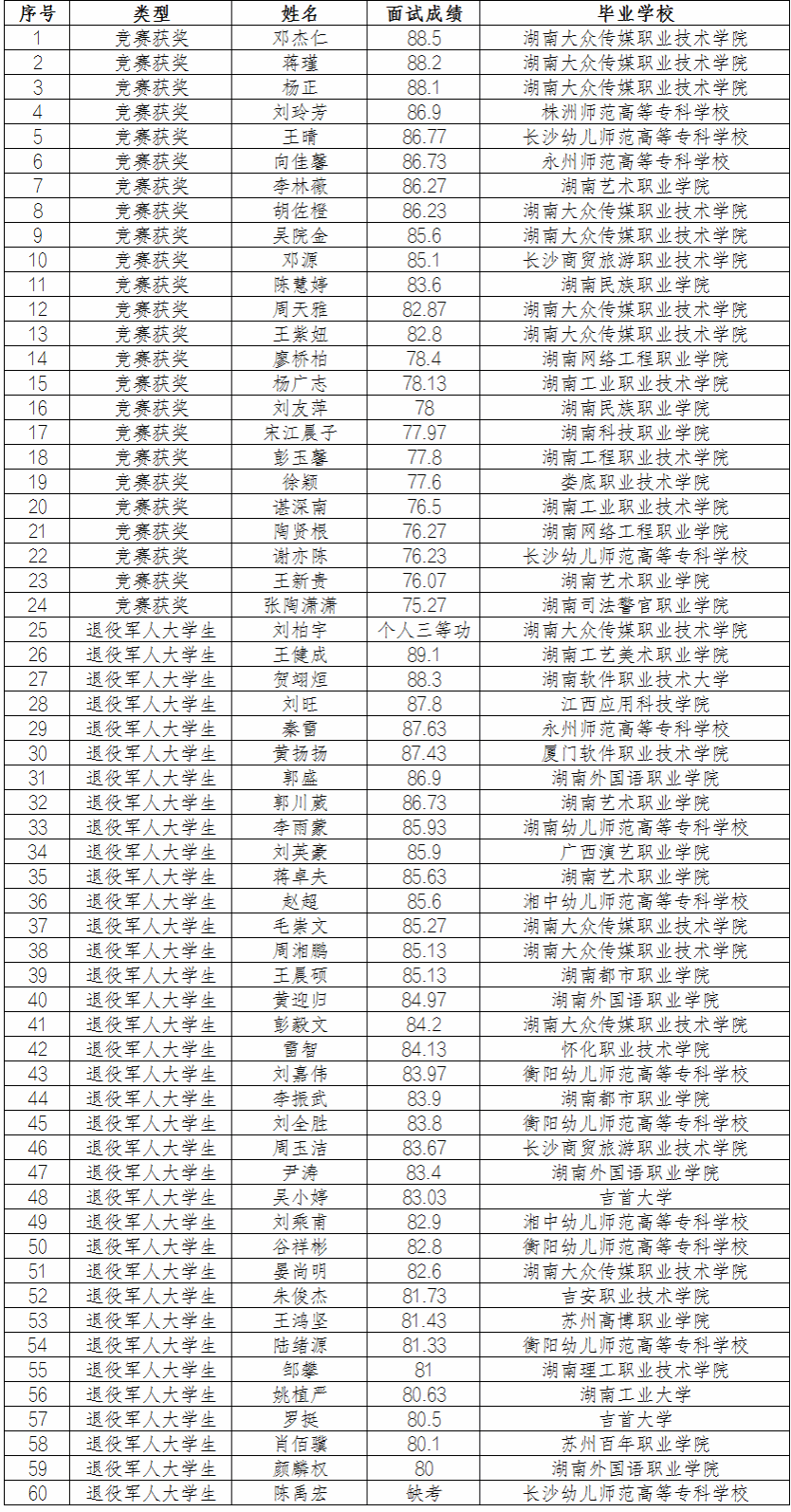 根据《湖南省教育厅关于做好2026年湖南省普通高等学校专升本考试招生工作的通知》和《湖南第一师范学院2026年专升本招生章程》相关规定,我校于2026年3月30日组织了免试生职业技能测试,现将测试成绩公布如下: